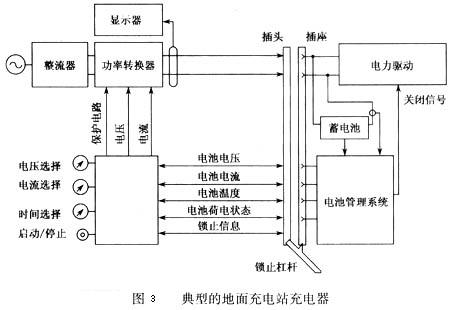 圖3為wei一yi典dian型xing的de地di麵mian充chong電dian站zhan中zhong充chong電dian器qi的de方fang案an,該gai充chong電dian器qi由you一yi個ge能neng將jiang輸shu人ren的de交jiao流liu電dian轉zhuan換huan為wei直zhi流liu電dian的de整zheng流liu器qi和he一yi個ge能neng調tiao節jie直zhi流liu電dian功gong率lv的de功gong率lv轉zhuan換huan器qi組zu成cheng,通tong過guo把ba帶dai電dian線xian的de插cha頭tou插cha入ru電dian動dong汽qi車che上shang配pei套tao的de插cha座zuo中zhong,直zhi流liu電dian能neng就jiu輸shu入ru蓄xu電dian池chi對dui其qi充chong電dian。充chong電dian器qi設she置zhi了le一yi個ge鎖suo止zhi杠gang杆gan以yi利li於yu插cha入ru和he取qu出chu插cha頭tou,同tong時shi杠gang杆gan還hai能neng提ti供gong一yi個ge確que定ding已yi經jing鎖suo緊jin的de信xin號hao以yi確que保bao安an全quan。根gen據ju充chong電dian器qi和he車che上shang電dian池chi管guan理li係xi統tong相xiang互hu之zhi間jian的de通tong訊xun,功gong率lv轉zhuan換huan器qi能neng在zai線xian調tiao節jie直zhi流liu充chong電dian功gong率lv,而er且qie充chong電dian器qi能neng顯xian示shi充chong電dian電dian壓ya、充電電流、充電量和充電費用等。