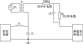 在圖1中,電纜用一個電阻與一個電容的並聯電路來建立模型,1MΩ的電阻為保護水電阻,變壓器將220V的電壓升到110kV後,加到電纜上。在測量試驗中,主要的要求是將一個50V的直流電壓疊加到電纜上,以測量出電纜的絕緣電阻R,為(wei)了(le)減(jian)小(xiao)測(ce)量(liang)誤(wu)差(cha),需(xu)要(yao)倒(dao)換(huan)電(dian)源(yuan)極(ji)性(xing),進(jin)行(xing)正(zheng)反(fan)向(xiang)兩(liang)次(ci)測(ce)量(liang)。此(ci)外(wai),在(zai)現(xian)場(chang)由(you)於(yu)變(bian)壓(ya)器(qi)中(zhong)性(xing)點(dian)常(chang)通(tong)過(guo)一(yi)小(xiao)電(dian)阻(zu)接(jie)地(di),此(ci)電(dian)阻(zu)的(de)阻(zu)值(zhi)僅(jin)為(wei)幾(ji)Ω到十幾Ω,為了能將直流電源疊加到電纜上,直流電源必須能提供足夠大的電流。在應用直流疊加法