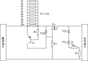在圖8中,R1—R10為1Ω的標準電阻,功率為2W,當電流超過預定值時,在並聯電阻上的壓降超過0.7V,三極管導通,此時,MOSFET將因柵源極間承受反向電壓而截止,從而切斷主電路;當電流值正常時,MOSFET正常導通,不會影響電路的正常工作。這種電路的缺點在於,如果電路中出現時斷時續的過電流時,MOSFET將會不斷地動作。為此,在圖3中還加入了其他保護元器件。