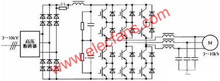 如圖1所示,圖中係統由電網高壓直接經高壓斷路器進入變頻器,經過高壓二極管全橋整流、直流平波電抗器和電容濾波,再通過逆變器進行逆變,加上正弦波濾波器,簡單易行地實現高壓變頻輸出,直接供給高壓電動機。
