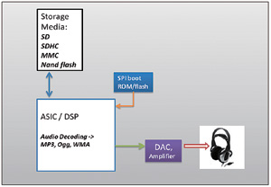便攜式音頻係統——有些手持式音頻係統采用ASIC,有些則采用DSP。MP3、Ogg和其他媒體文件等音頻內容通常存儲在高密度存儲設備中,如NAND閃存、安全數字(SD)卡、多媒體卡(MMC)和安全數字高容量卡(SDHC)等。
