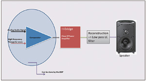 圖7為一個D類放大器係統。有時將這種放大器稱為數字放大器,但事實並非如此。其工作原理仍然與其他類型放大器相同,但D類放大器的輸入信號為PWM(脈衝寬度調製)信xin號hao。由you於yu數shu字zi輸shu入ru在zai邏luo輯ji高gao電dian平ping和he邏luo輯ji低di電dian平ping之zhi間jian來lai回hui切qie換huan,因yin此ci晶jing體ti管guan工gong作zuo在zai飽bao和he區qu間jian或huo截jie止zhi區qu間jian,但dan決jue不bu會hui工gong作zuo在zai有you效xiao區qu間jian,因yin此ci功gong耗hao始shi終zhong最zui低di。這zhe使shi得de功gong率lv效xiao率lv大da幅fu提ti高gao,但dan同tong時shi也ye會hui引yin起qi較jiao高gao的de總zong諧xie波bo失shi真zhen(THD)。
