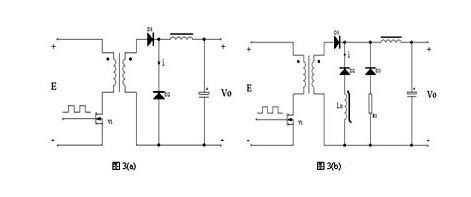 在圖3(a)所示的正激電源電路中,當初級功率管V1開始導通,次級整流二極管D1開始導通,D2開始截止時,由於二極管PN結的電荷存儲效應,D2中流過了電流變化率di/dt很大的反向恢複尖峰電流i,致使V1、D1中也有相應的尖峰電流流過,在漏感、線電感等因素的共同作用下會在電源輸出端產生高頻的導通噪聲。在D2上施加的反向電壓越大,D2的反向恢複時間越長,反向恢複電流變化率di/dt就越大,電源輸出噪聲也就越大。大的反向恢複尖峰電流,不僅會產生電源噪聲,也容易損壞整流器件。