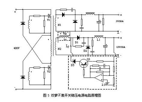 cifangdaqiwenyashiliyongkebaohediangandaotongyanshidewulitexinglaikongzhikaiguandianyuandezhankongbiheshuchugonglv,wendingdianyuanshuchudianyadeyizhongfangfa。zaikebaohedianganshangjiashangshidangdecaiyanghekongzhiyuanjian,tiaojieqidaotongyanshideshijian,jiukeyigouchengzuichangjiandecifangdaqiwenyadianlu。tu5是一個輸入為110Vac~220Vac/50HZ,輸出為5Vdc/20A,12Vdc/10A的雙管正激開關穩壓電源,其中5V是主控回路。其輔路12V輸shu出chu電dian流liu較jiao大da,對dui穩wen壓ya精jing度du和he負fu載zai穩wen定ding度du都dou有you較jiao高gao要yao求qiu,采cai用yong普pu通tong的de方fang法fa穩wen壓ya效xiao果guo都dou不bu是shi很hen理li想xiang,如ru果guo采cai用yong磁ci放fang大da器qi穩wen壓ya技ji術shu就jiu可ke圓yuan滿man解jie決jue這zhe一yi問wen題ti,使shi穩wen壓ya電dian路lu的de結jie構gou簡jian單dan,耗hao散san功gong率lv小xiao,並bing可ke達da到dao毫hao伏fu級ji的de穩wen壓ya精jing度du。