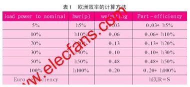 因yin此ci為wei了le提ti高gao光guang伏fu逆ni變bian器qi的de歐ou洲zhou效xiao率lv,僅jin僅jin降jiang低di額e定ding負fu載zai時shi的de損sun耗hao是shi不bu夠gou的de,必bi須xu同tong時shi提ti高gao不bu同tong負fu載zai情qing況kuang下xia的de效xiao率lv。歐ou洲zhou效xiao率lv是shi一yi個ge新xin的de參can數shu,主zhu要yao是shi針zhen對dui光guang伏fu逆ni變bian器qi提ti出chu來lai的de。由you於yu太tai陽yang光guang在zai不bu同tong時shi間jian,強qiang度du是shi不bu一yi樣yang的de,所suo以yi光guang伏fu逆ni變bian器qi其qi實shi並bing不bu會hui一yi直zhi工gong作zuo在zai額e定ding功gong率lv下xia,更geng多duo的de是shi工gong作zuo在zai輕qing負fu載zai的de時shi候hou。所suo以yi衡heng量liang光guang伏fu逆ni變bian器qi的de效xiao率lv,不bu能neng完wan全quan以yi額e定ding功gong率lv下xia的de效xiao率lv來lai衡heng量liang。所suo以yi歐ou洲zhou人ren就jiu想xiang出chu來lai了le一yi個ge新xin的de參can數shu–歐洲效率來衡量。歐洲效率的計算方法如表1。