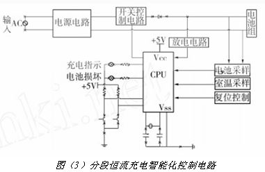 分段恒流充電智能化控製電路如圖(3)所示。該電路采用 CPU 控(kong)製(zhi),可(ke)對(dui)充(chong)電(dian)電(dian)池(chi)和(he)充(chong)電(dian)環(huan)境(jing)溫(wen)度(du)進(jin)行(xing)檢(jian)測(ce),對(dui)電(dian)池(chi)充(chong)電(dian)進(jin)行(xing)計(ji)時(shi),采(cai)用(yong)充(chong)電(dian)過(guo)程(cheng)中(zhong)電(dian)池(chi)的(de)電(dian)壓(ya)和(he)電(dian)流(liu),對(dui)分(fen)段(duan)恒(heng)流(liu)充(chong)電(dian)過(guo)程(cheng)進(jin)行(xing)控(kong)製(zhi)。