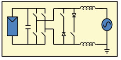 無變壓器的DC/AC逆變器在歐洲廣泛應用,但是在美國,這種產品隻是最近才在某些地區被使用。無變壓器的逆變器拓撲結構有很多種,而Fraunhofer研究所開發的HERIC拓撲表現出了很高的效率。傳統的全橋逆變器的結構如圖1所示,HERIC拓撲如圖2所示,此圖中還顯示了兩種新的開關/二極管對。這種拓撲利用獨有的續流路徑來減小開關和導通損耗,使效率提升到98%以上。