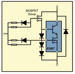 當一個ESBT同外置MOSFET和二極管/電阻配對的時候,整個電路看起來像一個3端器件,經驅動後能達類似IGBT或功率MOSFET的工作狀態。ESBT的關斷能量比IGBT低很多,能實現高效設計,並非常適合高頻率、高壓逆變器設計。