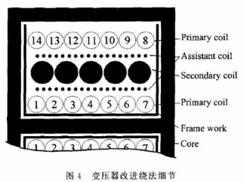 在電路中,噪聲電壓活躍節點並不是單一的。以本文分析的電路為例:除功率開關管的d極外,變壓器前級繞組的另一端U 也是一個噪聲電壓活躍節點,而且節點電壓的變化方向與場管的d極電壓情況相反。所以變壓器次級繞組的兩端是相位相反的噪聲電壓活躍節點。圖3所示的是采用節點相位平衡法後,變壓器骨架上的線圈分布情況。