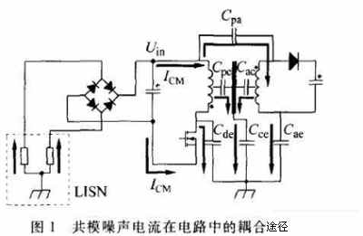 圖l中的共模電流, 在電路中的耦合途徑主要有3條:從噪聲源—— 功率開關管的d極通過C耦合到地;從噪聲源通過c。 耦合到變壓器次級電路,再通過C 耦合到地;從變壓器的前、次級線圈通過C?C 耦合到變壓器磁芯,再通過C 耦合到地。這3種電流是構成共模噪聲電流(圖1中的黑色箭頭所示)的主要因素。共模電流通過電源線輸入端的地線回流,從而被LISN取樣測量得到。