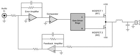 PWM信號進行適當的電平變換,然後送到柵極驅動器,這個驅動器控製由MOSFET(M1和M2)組成的雙態功率電路。放大後的信號然後通過輸出濾波器(消除PWM載波頻率),最(zui)終(zhong)僅(jin)僅(jin)放(fang)大(da)了(le)的(de)模(mo)擬(ni)音(yin)頻(pin)信(xin)號(hao)驅(qu)動(dong)揚(yang)聲(sheng)器(qi)。通(tong)過(guo)把(ba)濾(lv)波(bo)器(qi)輸(shu)入(ru)信(xin)號(hao)反(fan)饋(kui)到(dao)錯(cuo)誤(wu)放(fang)大(da)器(qi)輸(shu)入(ru)端(duan),進(jin)行(xing)外(wai)部(bu)環(huan)路(lu)濾(lv)波(bo),降(jiang)低(di)了(le)失(shi)真(zhen)和(he)噪(zao)聲(sheng),進(jin)一(yi)步(bu)提(ti)高(gao)了(le)音(yin)頻(pin)輸(shu)出(chu)保(bao)真(zhen)度(du)。