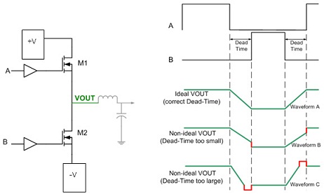D類放大器死區時間(即兩個開關均處於關閉狀態時的時間段)直接影響到效率和THD。過於短暫的死區時間會引起直通電流,降低效率,過長的死區時間又會增大THD,這會給音頻保真度帶來不利影響。