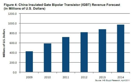 經濟複蘇帶動工業與消費電子的需求增長,以及中國政府推出的經濟刺激政策,不斷推動IGBT銷售額成倍增長。在消費方麵,IGBT用於家用電器、相機和手電。IHS公司預測,未來四年消費應用領域的IGBT的複合年度增長率將為15%。