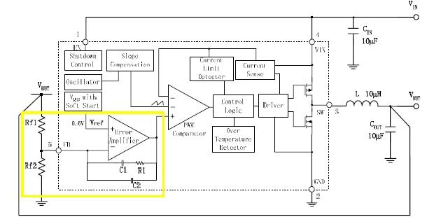 反饋電阻Rf1和Rf2的第一個作用是設置Buck電路的輸出電壓值,如圖2所示,穩態時,運算放大器的反相輸入端和同相輸入端電壓是相等的,於是可以得到輸出電壓計算公式: