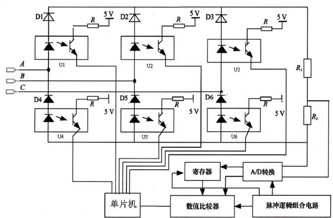傳統的檢測電路設計:圖2是一種傳統的數字型自然換相點檢測電路的原理圖,其中占用了7個I/O口,並且還需要ADC、數shu值zhi寄ji存cun器qi和he脈mai衝chong邏luo輯ji組zu合he電dian路lu。電dian路lu相xiang當dang複fu雜za,在zai程cheng序xu設she計ji上shang也ye需xu要yao進jin行xing設she計ji以yi後hou才cai能neng對dui自zi然ran換huan相xiang點dian作zuo出chu判pan斷duan。另ling外wai這zhe種zhong方fang法fa還hai存cun在zai換huan相xiang點dian丟diu失shi的de情qing況kuang,丟diu失shi的de概gai率lv會hui隨sui采cai樣yang頻pin率lv的de降jiang低di而er增zeng大da,極ji大da降jiang低di了le控kong製zhi的de可ke靠kao性xing。