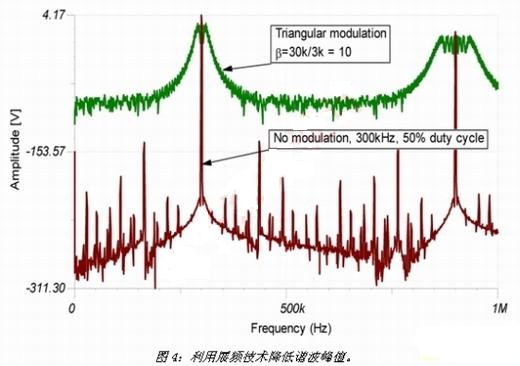 zuihou,benwenjiangtantaolingyixiangyuelaiyueshoudaoguangfanshiyongdejishu,nenggoujiangfengzhixiebonengliangsanbuyujiaodadepindai,yiyouxiaojiangdigainengliang。gaijishubeichengweizhanpinpinlvdoudong(SSFD),能neng夠gou通tong過guo諧xie波bo峰feng值zhi的de降jiang低di將jiang噪zao聲sheng信xin號hao從cong窄zhai頻pin變bian成cheng寬kuan頻pin,以yi改gai變bian噪zao聲sheng頻pin譜pu。其qi中zhong必bi須xu了le解jie能neng量liang頻pin譜pu的de變bian化hua,而er整zheng個ge能neng量liang則ze維wei持chi不bu變bian。最zui終zhong的de結jie果guo是shi噪zao聲sheng水shui平ping一yi般ban會hui增zeng加jia,從cong而er損sun害hai高gao保bao真zhen係xi統tong。圖tu4顯示發生的諧波擴散及峰值降低。一般降低的幅度為5至10dB,後續的諧波會增加峰值降低的幅度。