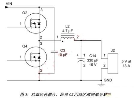 在(zai)一(yi)個(ge)電(dian)源(yuan)的(de)正(zheng)確(que)配(pei)置(zhi)中(zhong),必(bi)須(xu)將(jiang)大(da)電(dian)流(liu)導(dao)體(ti)的(de)回(hui)路(lu)部(bu)分(fen)縮(suo)減(jian)至(zhi)最(zui)小(xiao)。這(zhe)樣(yang)做(zuo)能(neng)夠(gou)將(jiang)作(zuo)為(wei)天(tian)線(xian)源(yuan)和(he)發(fa)射(she)能(neng)量(liang)的(de)電(dian)感(gan)降(jiang)至(zhi)最(zui)低(di)。其(qi)中(zhong)一(yi)個(ge)層(ceng)麵(mian)是(shi)有(you)效(xiao)放(fang)置(zhi)元(yuan)件(jian)及(ji)選(xuan)用(yong)去(qu)耦(ou)電(dian)容(rong)。圖(tu)3顯示同步降壓轉換器的輸出功率級與濾波器。C3將功率級去耦合,以便在Q2啟動時提供低阻抗源。為了將輻射發射量降至最低,必須如圖所示連接C3,其中電容的固有阻抗、電路信號線及通過電感的互連均縮減至最小。另外,也需要具有諸如X7R等高自振頻率的高品質電容電介質。