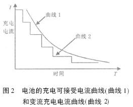 鋰離子電池可接受的充電電流隨充電時間呈指數規律下降, 若充電電流曲線在電池可接受充電電流曲線(圖2中曲線1) 以上會導致電池電解液發生析氣反應, 影響電池壽命.