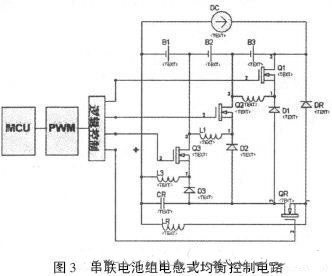 係統中, 及時檢測電池組中各電池的狀態信息, 送入MCU 中, 通過算法處理, 控製PWM 的輸出, 驅動開關器件的導通和關斷. 當某個電池電壓較高時, 相應的開關器件導通, 電池將能量儲存到相應的電感中, 當開關斷開後, 能量轉移到下遊的電池, 多餘能量轉移到公共電容上並回饋給充電電路.