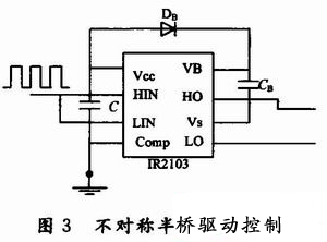 不對稱半橋驅動電路,如圖3所示。驅動集成芯片采用IR公司的IR2103,其輸出級作為推挽驅動輸出,以直接耦合的方式與主電路的開關管相連接,由HO和LO的輸出分別作為驅動橋式電路的上、下橋臂。為了實現上橋臂驅動電路的地電位與主電路的同步浮動,采用由DB和CB組成的外接自舉電路。