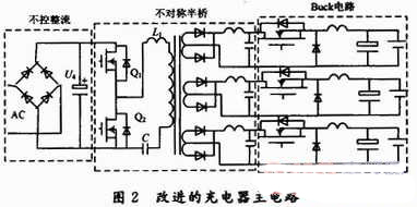 改進的新型充電器主電路,如圖2所示。前級采用軟開關buduichengbanqiaoshixianleduoludegelishuchu,bingqieliyongzishenchanshengdejishengcanshu,shixianxiezhenshilingdianyaruankaiguanyicijianxiaokaiguandesunhao,tongshiyebimianleyinbianyaqilouganerdailaidedianyajianfeng。houjicaiyongchengshujiandandeBuck電路拓撲,實現降壓並用此來滿足三段式充電的要求。