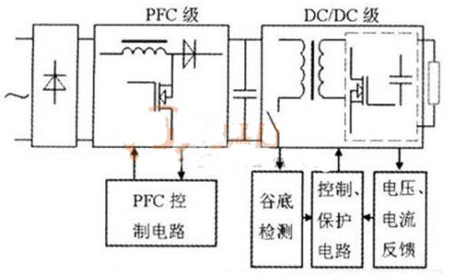 所研究的開關電源結構如圖1所示,采用兩級PFC結構,由PFC預變換器、隔離變換器和同步整流電路組成的DC/Dc變換器以及檢測與保護電路組成。交流電壓經整流後先輸入到PFC預(yu)變(bian)換(huan)器(qi)進(jin)行(xing)功(gong)率(lv)因(yin)數(shu)校(xiao)正(zheng)變(bian)換(huan),再(zai)由(you)電(dian)源(yuan)控(kong)製(zhi)電(dian)路(lu)控(kong)製(zhi)隔(ge)離(li)變(bian)換(huan)器(qi),將(jiang)直(zhi)流(liu)電(dian)壓(ya)轉(zhuan)換(huan)成(cheng)高(gao)頻(pin)交(jiao)流(liu)脈(mai)衝(chong)電(dian)壓(ya),此(ci)脈(mai)衝(chong)電(dian)壓(ya)經(jing)同(tong)步(bu)整(zheng)流(liu)器(qi)整(zheng)流(liu)、濾波電路濾波後,得到所需的直流。