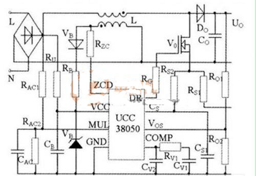 UCC38050為過渡模式PFC控製器,功耗低,工作電流僅1.5mA.PWM開關頻率由自激振蕩產生而且頻率可變,不存在Boost二極管反向恢複過程,減少了反向恢複損耗,非常適合於中小功率綠色開關電源設計。