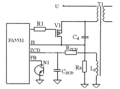 功率隔離變換器電路如圖5所示,由控製電路和反激式變換器組成。圖中,變壓器輔助繞組LZ、電阻RZCD、電容CzcD組成穀底探測電路,為控製芯片FA5531提供穀底檢測信號。光電耦合器N1次級將輸出電壓反饋信號輸入控製芯片。電路啟動後,FA5531輸出驅動信號使V1導通,V1電流上升,此電流由Rs檢測輸入到控製芯片的IS引腳,與由反饋輸入FB引腳的電壓決定的參考電壓進行比較,達到參考電壓時,V1關guan斷duan,變bian壓ya器qi繞rao組zu電dian壓ya反fan相xiang,變bian壓ya器qi初chu級ji電dian感gan向xiang次ci級ji負fu載zai饋kui送song能neng量liang。當dang向xiang次ci級ji饋kui送song能neng量liang過guo程cheng結jie束shu時shi,次ci級ji電dian流liu下xia降jiang到dao零ling。變bian壓ya器qi漏lou感gan與yu開kai關guan管guan寄ji生sheng電dian容rongCd構成了諧振電路,變壓器輔助繞組感應此諧振電路的諧振電壓,並輸入到FA5531P的ZCD引腳。當次級電流下降到零時,諧振電路的諧振電壓迅速下降,輔助繞組的感應電壓也迅速下降,當ZCD引腳上的電壓降至穀底探測閾值時,FA5531P驅動輸出使V1重新導通。由於電阻RzcD、電容CzcD會引入延時,選擇合適的RzcD、CzcD值,就可實現V1零電壓開通。