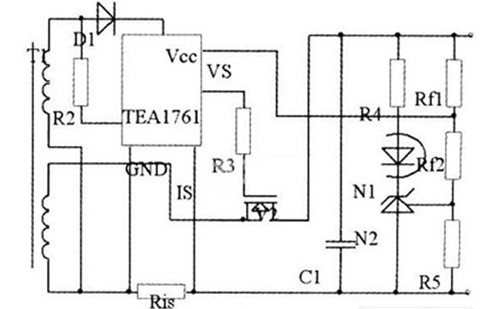 采用TEAl761T的同步整流電路如圖6所示。同步信號SRSENSE直接取自高頻變壓器次級,R3是輸出電流取樣電阻,通過選擇合適的R3的阻值,可控製最大輸出電流。TEA1761T具有欠電壓鎖定和啟動功能,D2為TEA1761T提供電源,同時檢測輸出電壓,當Vcc引腳電壓高於8.6V,TEA1761T激活同步整流電路和輸出電壓與輸出電流檢測電路。當電壓低於8.1v時,則進入欠電壓鎖定狀態,驅動輸出保持低電平,光耦反饋輸出被封鎖。