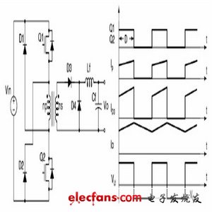 雙管正激變換器的原理圖與波形如圖1所示。雙管正激變換器的工作可以分為三個過程:能量轉移階段、變壓器磁複位階段和死區階段。在能量轉移階段,原邊的兩個開關都導通,能量從輸入端向輸出端轉移。在變壓器磁複位階段,原邊的兩個二極管都導通,使變壓器繞組承受反相輸入電壓,從而實現變壓器磁複位。當變壓器完全複位後,變換器工作在死區階段,即原邊無電流、副邊續流。在複位過程中,雙管正激開關MOSFET被箝位在輸入電壓。MOSFET上的電壓應力小於單管正激,至少低一倍。這樣我們可選取具有低導通電阻Rdson的低電壓MOSFET,以獲得低損耗。