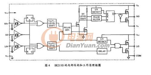 IR2110的內部結構和工作原理框圖如圖4所示。圖中HIN和LIN為逆變橋中同一橋臂上下兩個功率MOS的驅動脈衝信號輸入端。SD為保護信號輸入端,當該腳接高電平時,IR2110的輸出信號全被封鎖,其對應的輸出端恒為低電平;而當該腳接低電平時,IR2110的輸出信號跟隨HIN和LIN而變化,在實際電路裏,該端接用戶的保護電路的輸出。HO和LO是兩路驅動信號輸出端,驅動同一橋臂的MOSFET