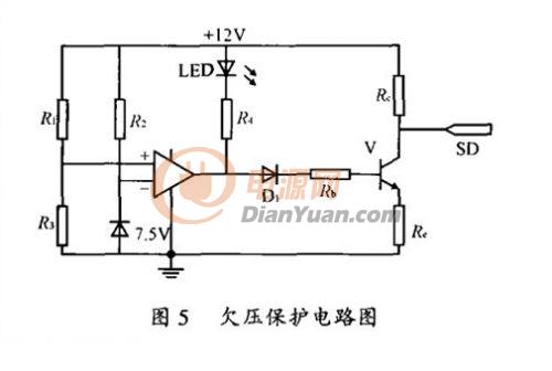 欠壓保護電路如圖5所示,它監測蓄電池的電壓狀況,如果蓄電池電壓低於預設的10.8V,保護電路開始工作,使控製器SG3524的腳10關斷端輸出高電平,停止驅動信號輸出。