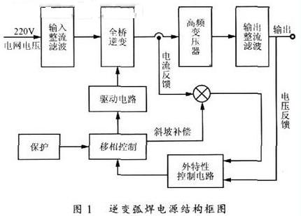 220V交jiao流liu市shi電dian經jing整zheng流liu濾lv波bo後hou做zuo為wei全quan橋qiao逆ni變bian器qi的de直zhi流liu輸shu入ru,其qi輸shu出chu為wei脈mai寬kuan可ke調tiao的de高gao頻pin交jiao流liu電dian壓ya方fang波bo,通tong過guo高gao頻pin變bian壓ya器qi隔ge離li降jiang壓ya後hou,再zai經jing過guo輸shu出chu整zheng流liu濾lv波bo得de到dao滿man足zu焊han接jie要yao求qiu的de直zhi流liu電dian源yuan。