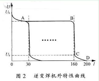 圖2所示即為高頻逆變焊機所普遍采用的一種行之有效的恒流帶外拖的外特性曲線。其中Uk為空載電壓,即焊機不工作時的輸出電壓。一個較高的空載電壓有助於起弧階段快速建立起穩定的工作狀態。一般空載電壓為90V左右;ABduanweiqihujieduan,jihanjijianligongzuozhuangtaideguoduguocheng,jinsiyuhengyashuchu。zhegeguochengzhongbianhuanqiyizuidamaikuanshuchu,yizuikuaisududadaoshedinggongzuodianliushigaijieduanjieshu;BC段為穩定工作階段,近似為恒流過程,使焊機具有一個平穩、恒定的工作電流;CDduanweiwaituojieduan,youyuhanjizaipinfandeqihuhegongzuoguochengzhonghanqianghenrongyihegongjianduanluzhanlian,zaochenghanjieguochengbushunchang,ruguocishixitongjiancedaoyigejiaodideduanludianyahounenggouxiangyingdizengdashuchudianliuzhi,jiukeyijiangzhanlianbufenrongduan,congerhuodeyigelianxu、平穩的焊接過程。