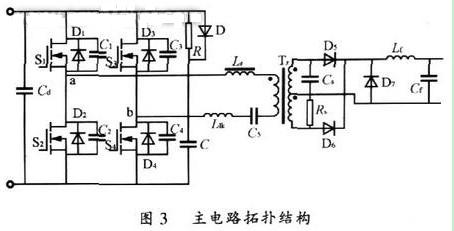 本係統所采用的全橋變換器拓撲結構如圖3所示。主電路中選用了MOSFET作為主功率開關器件,這是因為本係統的設計頻率為100 kHz,而與IGBT一般最高工作在幾十kHz相比,MOSFET的工作頻率則要高的多。另外由於MOSFET自身帶有反並聯二級管和較大的輸出電容,如圖3中D1~D4、C1~C4所示,為軟開關的實現提供了便利條件。變壓器副邊輸出整流結構有全波整流(變壓器副邊三抽頭+兩隻二級管)和全橋整流(變壓器副邊兩抽頭+四隻二級管)兩種結構可供選擇,前者適合於輸出低壓大電流的場合,後者適合於輸出高壓小電流場合。由於逆變焊機可看作是一個低壓大電流源.因此選用全波整流。