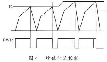 在本方案所采用的峰值電流控製模式下,腳19(RAMP)端duan的de鋸ju齒chi波bo信xin號hao是shi從cong變bian壓ya器qi原yuan邊bian的de電dian流liu信xin號hao經jing采cai樣yang整zheng流liu得de到dao的de。但dan由you於yu實shi際ji上shang原yuan邊bian電dian流liu信xin號hao波bo形xing上shang升sheng斜xie率lv較jiao緩huan,與yu給gei定ding比bi較jiao時shi,容rong易yi因yin為wei幹gan擾rao或huo毛mao刺ci抖dou動dong產chan生sheng誤wu動dong作zuo。因yin此ci實shi際ji應ying用yong時shi,先xian將jiang原yuan邊bian電dian流liu的de采cai樣yang整zheng流liu值zhi與yu芯xin片pian定ding時shi電dian容rongCT上的鋸齒波相疊加,經過斜坡補償後,再送入腳19(RAMP)端進行比較控製。峰值電流控製過程如圖4所示。