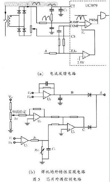 (2)外拖特性實現 正常工作時,輸出電壓反饋值Vfb大於外拖給定值Vz,比較器U3的輸出為零,對加法器U4沒有影響,焊接電流由恒流給定值Iref決定;當焊槍與工件粘連短路時,Vfb小於VZ,比較器U3的輸出為高,相當於給增大了Iref,UC3879內部誤差放大器的輸出Ve也增大,焊接電流則隨之增大,從而實現外拖。