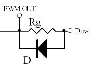 以上討論的是MOSFET ON狀態時電阻的選擇,在MOSFET OFF狀態時為了保證柵極電荷快速瀉放,此時阻值要盡量小.通常為了保證快速瀉放,在Rg上可以並聯一個二極管.當瀉放電阻過小,由於走線電感的原因也會引起諧振(因此有些應用中也會在這個二極管上串一個小電阻),但是由於二極管的反向電流不導通,此時Rg又參與反向諧振回路,因此可以抑製反向諧振的尖峰.這個二極管通常使用高頻小信號管1N4148.