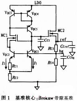 目前的基準核心可以有多種實現方案:混合電阻,Buck voltage transfer cell,但是修調複雜,不宜工業化。本設計采用Brokaw基準核心,其較易實現高壓基準輸出,並且其溫漂、PSR及啟動特性均較好。本文采用的改進的Brokaw基準核心的結構如圖1所示。