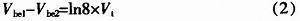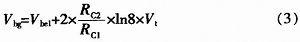 其中I是三極管射極電流,Is與射極麵積成正比,n為一常數,取1。這裏,取VQC2:VQC1=8:1,因此Is2=8xIs1,又I1=I2,分別代入(1)並相除,整理得: