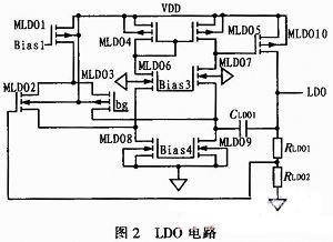 LDO在低頻時的PSR主要取決於運放的增益,為此選擇折疊共源共柵電路。此LDO電路基於文獻中的電路修改,如圖2所示,並采用PSR高的偏置生成電路。