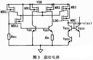 這樣雖然能啟動,但是,正常工作時,此大啟動電流bias-start將通過VQCS1和VQCS3流向地,增加了係統的負擔。因此,在電流輸出管MB3下加入控製管MBC,並使得在正常工作時,LDO的高電壓足以使MBC關斷,從而降低啟動電路的損耗。