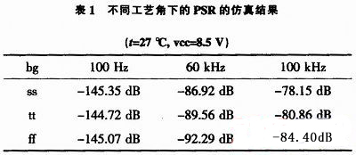 表1為輸出電壓bg在不同工藝角下的PSR的仿真結果,本電路在不同工藝角下都能在高電源幹擾的芯片中正常工作。