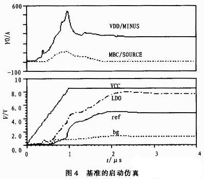 MBC控製作用的簡述:在1μs時流過100μA的啟動電流,當LDO、ref、bg建立最低工作電壓後,啟動電路開始關斷過程,電流急劇減小,並最終在2μs時接近0A。整個電路正常運行時消耗的電流是266μA。