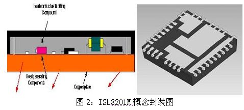 Intersil的ISL8201M模塊集成了一個完整的DC/DC轉換器所需的大多數組件,包括PWM控製器、MOSFET和電感器。其輸入電壓範圍為3-20V,電流能力為10A。它可實現比傳統 SIP DC/DC模塊高得多的開關頻率,通過不使用MOSFET封裝並將這些組件共同封裝在一個緊湊的15×15×3.5mm的QFN封裝中(見圖2),實現了極佳的效率和熱性能。ISL8201M是一個係列模塊中的第一個產品,尺寸和性能的進一步改善正在開發當中。