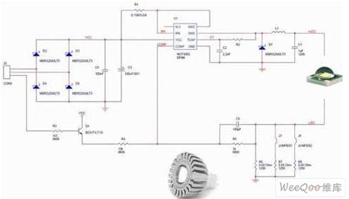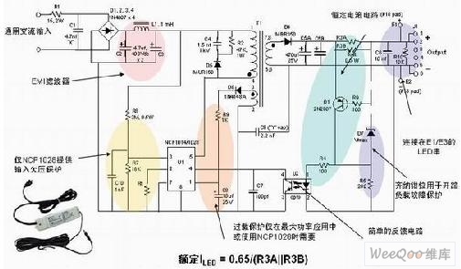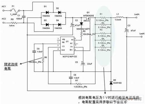 另ling一yi方fang麵mian,如ru上shang所suo述shu,在zai不bu需xu要yao隔ge離li的de應ying用yong中zhong,可ke以yi采cai用yong較jiao為wei簡jian單dan的de降jiang壓ya拓tuo撲pu結jie構gou,這zhe種zhong結jie構gou所suo使shi用yong的de電dian感gan比bi變bian壓ya器qi小xiao得de多duo,而er且qie隻zhi需xu要yao很hen少shao的de元yuan件jian來lai實shi現xian這zhe種zhong解jie決jue方fang案an。這zhe種zhong架jia構gou采cai用yong的de是shi峰feng值zhi電dian流liu控kong製zhi(PCC)模式,工作在深度連續導電模式(CCM)。這種架構具有多種優勢,如可以消除使用大電解輸出電容、具有“良好”穩流的簡單控製原理,以及能夠充分利用安森美半導體的動態自供電(DSS)技術能力來直接從交流線路為驅動器供電。圖3顯示的是安森美半導體NCP1216 PWM電流模式控製器的應用設計示意圖。