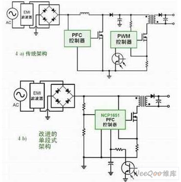 圖2:需要PFC的LED驅動應用中不同架構對比。