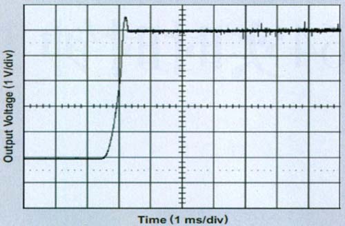 在一些典型的啟動應用中,TPS64203限流值慢慢上升,以提供限流的受控軟啟動。在這種應用中,限流電路和軟啟動均無效;因此,啟動浪湧電流會很大,而輸出電壓會稍稍過衝,如圖 4 所示。