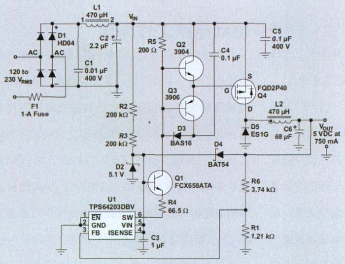 圖 1 顯示了完整的轉換器。整流器電路使用一個標準、快速開關整流器二極管橋接 (D1) 和一個LC濾波器(L1和C2),我們將對其餘組件進行更加詳細的介紹。