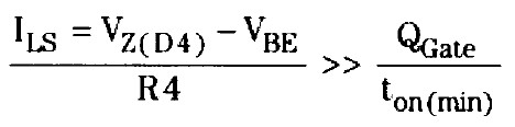 電容C4和二極管D3對驅動電路的功能至關重要。通過選擇電阻R5來將12V柵極驅動電平設置在整流器輸出電壓以下。二極管D3將電容C4限定在這一電平。特別是,當U1的開關引腳輸出一個低信號來開啟功率FET時,信號被電平位移到Q3的基極。晶體管Q3開啟,並快速地將Q4的柵—源電容CGS充電至 12V。如果沒有C4和D3的話,關閉Q4會讓Q3成為一種漏極接地的昂貴的高壓雙極型晶體管。當U1的開關引腳輸出一個高信號來關閉功率FET時,該信號被電平位移至Q2的基極。Q2開啟,有效地將Q4的柵極與輸入電壓連接。在沒有起到本地電源作用的電容C4的情況下,晶體管Q2和Q3無法提供快速(且因此而高效地)上拉或下拉Q4柵極電容所必需的快速電流峰值,注意到這一點很重要。另外,由R4設定的電平位移器電流ILS必須足夠高,以在ton(min) 期間移動Q4的柵極電荷QGate。也就是說: